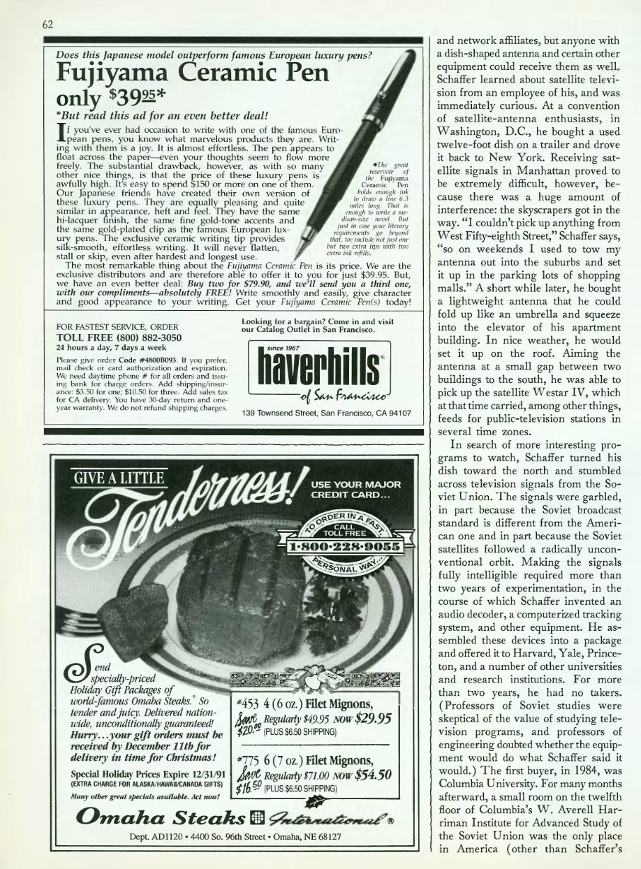 In search of more interesting programs to watch, Schaffer turned his dish toward the north and stumbled across television signals from the Soviet Union. The signals were garbled, in part because the Soviet broadcast standard is different from the American one and in part because the Soviet satellites followed a radically unconventional orbit. Making the signals fully intelligible required more than two years of experimentation, in the course of which Schaffer invented an audio decoder, a computerized tracking system, and other equipment. He assembled these devices into a package and offered it to Harvard, Yale, Princeton, and a number of other universities and research institutions. For more than two years, he had no takers. (Professors of Soviet studies were skeptical of the value of studying television programs, and professors of engineering doubted whether the equipment would do what Schaffer said it would.) The first buyer, in 1984, was Columbia University. For many months afterward, a small room on the twelfth floor of Columbia’s W. Averell Harriman Institute for Advanced Study of the Soviet Union was the only place in America (other than Schaffer’s apartment) where Soviet television could be watched live.
