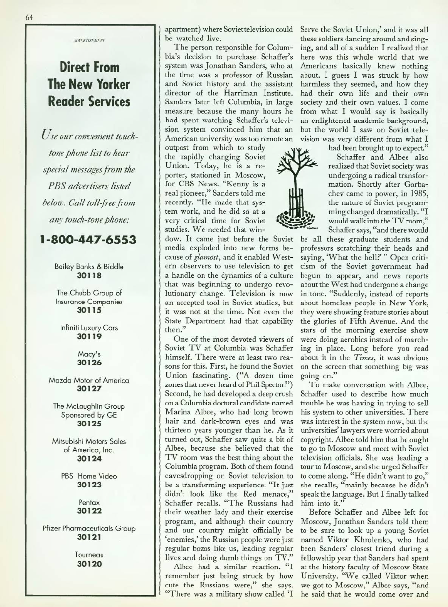 Albee had a similar reaction. “I remember just being struck by how cute the Russians were,” she says. “There was a military show called ‘I Serve the Soviet Union,’ and it was all these soldiers dancing around and singing, and all of a sudden I realized that here was this whole world that we Americans basically knew nothing about. I guess I was struck by how harmless they seemed, and how they had their own life and their own society and their own values. I come from what I would say is basically an enlightened academic background, but the world I saw on Soviet television was very different from what I had been brought up to expect.” Schaffer and Albee also realized that Soviet society was undergoing a radical transformation. Shortly after Gorbachev came to power, in 1985, the nature of Soviet programming changed dramatically. “I would walk into the TV room,” Schaffer says, “and there would be all these graduate students and professors scratching their heads and saying, ‘What the hell?”‘ Open criticism of the Soviet government had begun to appear, and news reports about the West had undergone a change in tone. “Suddenly, instead of reports about homeless people in New York, they were showing feature stories about the glories of Fifth Avenue. And the stars of the morning exercise show were doing aerobics instead of marching in place. Long before you read about it in the Times, it was obvious on the screen that something big was going on.”