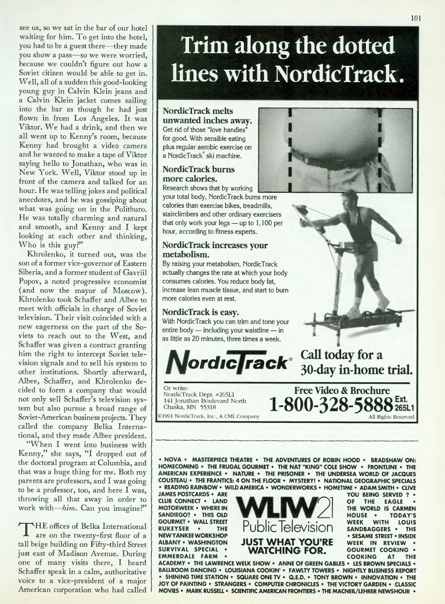 Khrolenko, it turned out, was the son of a former vice-governor of Eastern Siberia, and a former student of Gavriil Popov, a noted progressive economist (and now the mayor of Moscow). Khrolerlko took Schaffer and Albee to meet with officials in charge of Soviet television. Their visit coincided with a new eagerness on the part of the Soviets to reach out to the West, and Schaffer was given a contract granting him the right to intercept Soviet television signals and to sell his system to other institutions. Shortly afterward, Albee, Schaffer, and Khrolenko decided to form a company that would not only sell Schaffer’s television system but also pursue a broad range of Soviet-American business projects. They called the company Belka International, and they made Albee president.