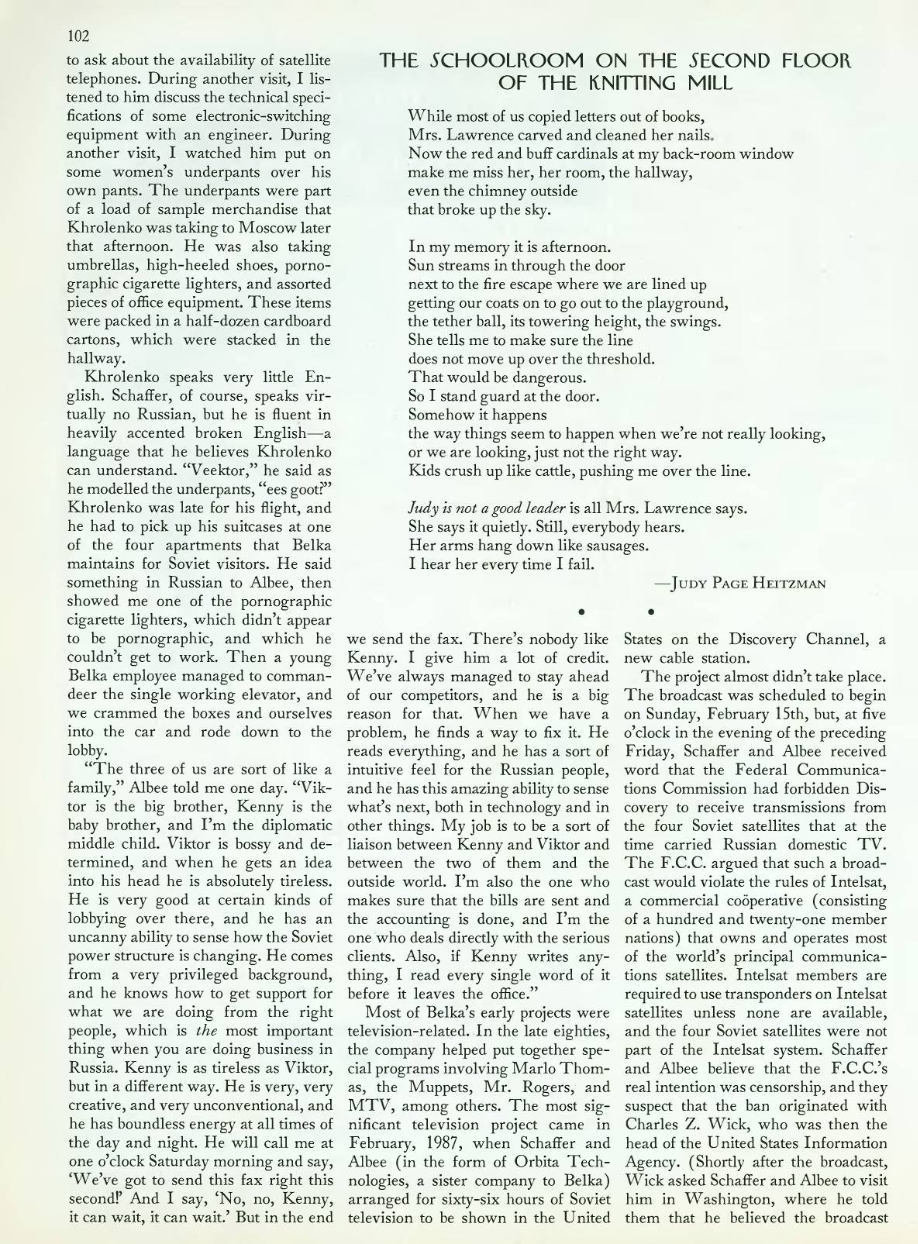 Khrolenko, it turned out, was the son of a former vice-governor of Eastern Siberia, and a former student of Gavriil Popov, a noted progressive economist (and now the mayor of Moscow). Khrolerlko took Schaffer and Albee to meet with officials in charge of Soviet television. Their visit coincided with a new eagerness on the part of the Soviets to reach out to the West, and Schaffer was given a contract granting him the right to intercept Soviet television signals and to sell his system to other institutions. Shortly afterward, Albee, Schaffer, and Khrolenko decided to form a company that would not only sell Schaffer’s television system but also pursue a broad range of Soviet-American business projects. They called the company Belka International, and they made Albee president.