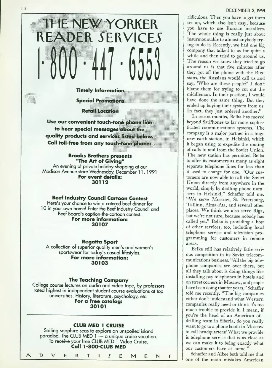 Belka still has relatively little serious competition in its Soviet telecommunications business. “All the big telephone companies are over there, but all they talk about is doing things like installing pay telephones in hotels and on street corners in Moscow, and people have been doing that for years,” Schaffer told me recently. “The big companies either don’t understand what Western companies really need or think it’s too much trouble to provide it. I mean, if you’re the head of an American oildrilling team in Siberia, do you really want to go to a phone booth in Moscow to call headquarters? What we provide is telephone service that is as close as we can make it to being exactly what our customers have at home.”